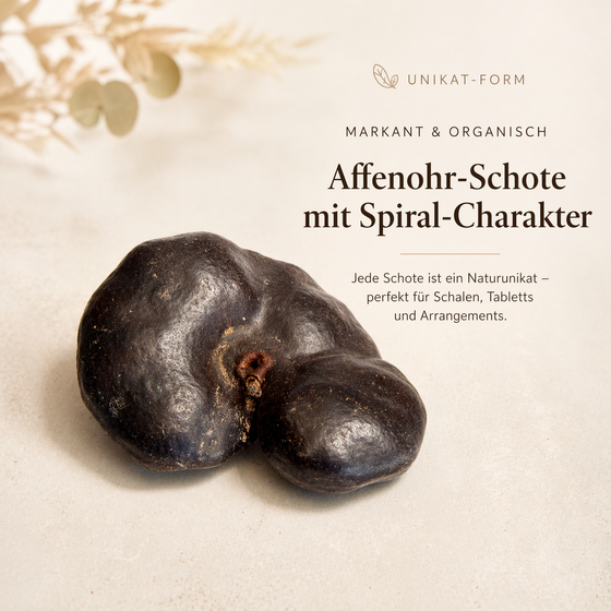 Die Affenohr Schote, botanisch Enterolobium contortisiliquum, ist eine außergewöhnliche Naturdeko aus Brasilien und eine stilvolle Wahl für alle, die echte Naturmaterialien mit exotischem Charakter schätzen. Mit ihrer markanten, geschwungenen Form und der dunklen, naturbelassenen Oberfläche bringt diese Dekoschote eine warme, organische Ausstrahlung in Wohnräume, Schalenarrangements und kreative Dekokonzepte. Als echte Schote vom Ohrstöpselbaum steht sie für authentische Dekoration aus der Natur und eignet sich ideal für Menschen, die besondere Dekoobjekte, botanische Formen und exotische Akzente suchen.