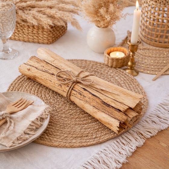 Ein dramatischer Kontrast: Die dunkle Akazienrinde setzt spannende Akzente und lässt sich wunderbar mit den warmen Tönen des Bananenblatt Bündels kombinieren.