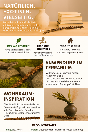 Die getrockneten Stiele stammen aus Indien und werden aus Musa acuminata gewonnen. Durch die Verholzung wirken sie robust und behalten ihre Form dauerhaft. Farbe und Struktur variieren naturbedingt – so wird jedes Arrangement individuell. Als langjähriger Anbieter für Naturdekoration liefert NaDeco hochwertige, naturbelassene Materialien direkt zu Ihnen nach Hause.