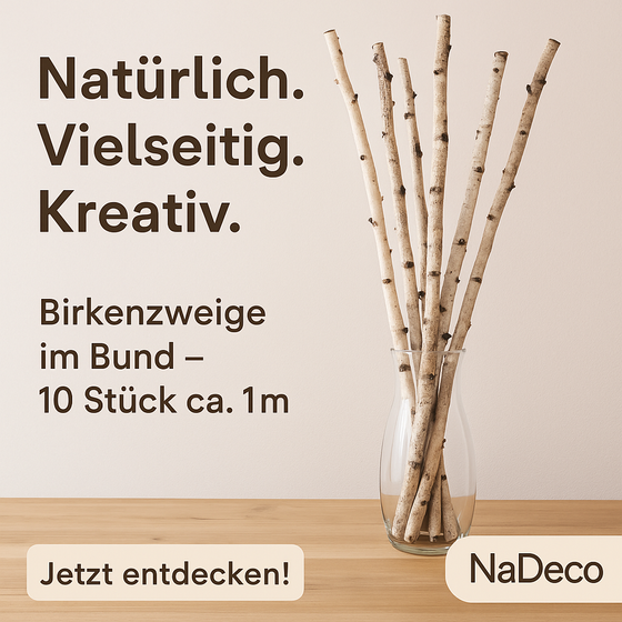 Bei diesen naturbelassenen Deko-Ästen handelt es sich um NaDeco Birkenzweige im Bund. Die Birkenäste werden in einem Bund mit 10 Stück geliefert, wobei jeder einzelne Birken-Zweig eine Länge von etwa 1 Meter aufweist. Die Birkenäste haben einen Durchmesser zwischen 1 und 3 Zentimetern. Die Birkenzweige von NaDeco sind naturbelassen, dies bedeutet, dass sie weder eingefärbt noch auf andere Art und Weise chemisch behandelt wurden. Importiert werden die NaDeco Birkenzweige im Bund aus China; die einzelnen Deko-Äste können kleine Astabschnitte aufweisen. Insgesamt kommen die Birken-Zweige in einem rustikalen Äußeren daher. Die NaDeco Birkenzweige im Bund können auf vielfältige Art und Weise zum Einsatz kommen. Die Deko-Äste der Birke können zum Basteln, zur sonstigen Weiterverarbeitung sowie zum Dekorieren von Wohn- und Geschäftsräumen genutzt werden. Die Birkenäste im Bund in Natur lassen sich in großen Bodenvasen arrangieren, Hängedekorationen zu basteln oder in Bilderrahmen in Szene gesetzt und als Wanddekoration verwendet werden. Zudem lassen sich mithilfe der Birkenäste tolle Hängedekorationen kreieren, große Weihnachtssterne zaubern oder mithilfe eines Bandes oder Seils aus Naturfasern zu dekorativen Holzbündeln oder Raumteilern weiterverarbeiten. Die NaDeco Birkenzweige im Bund lassen sich wunderbar mit anderen natürlichen Dekoelementen aus dem Sortiment von NaDeco wie beispielsweise Stricken aus Kokos, Sisal oder Baumwolle, Tannenstreu, Herbstlaub mit Stiel kombinieren. Da es sich bei diesen NaDeco Birkenzweige im Bund um ein unbehandeltes Naturprodukt handelt, können die Birkenäste auch bedenkenlos in Volieren und Terrarien zum Einsatz kommen. Die tierischen Bewohner können die Birkenaste sowohl als Knabber- und Schreddermaterial als auch als Sitzstangen oder Klettermöglichkeiten nutzen. Aufgrund der Tatsache, dass es sich bei diesen NaDeco Birkenzweige im Bund um reine Naturprodukte handelt, ist es möglich, dass die Birkenäste in Bezug auf ihre Form, Farbe und Größe von der Produktabbildung und der Produktbeschreibung abweichen.