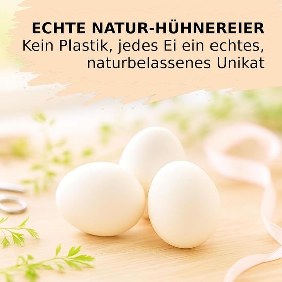 Bei diesen Dekoeiern handelt es sich um weiße Hühnereier. Die Ostereier verfügen über eine Höhe von etwa 5 bis 6 Zentimetern und einen Durchmesser von circa 3 bis 4 Zentimetern. Die Lieferung der Hühnereier in Weiß erfolgt in einer Packung von 24 Stück. Die Ostereier wurden geleert und im Anschluss gereinigt. Die Hühnereier in Weiß können ideal mit den NaDeco Draht-Aufhängern versehen werden. Zum Aufhängen der weißen Hühnereier müssen die Enden eines Drahtaufhängers zusammengebogen und in die bereits vorhandene Öffnung des Ostereis geschoben werden. Im Anschluss daran gilt es den Drahtaufhänger mit einem schönen Band, dünnen Strick oder dekorativen Faden zu versehen und an gewünschter Stelle wie beispielsweise einem Osterstrauch aufzuhängen. Bei diesen weißen Hühnereiern handelt es sich um reine Naturprodukte. Aus diesem Grund können die Deko-Eier sowohl hinsichtlich ihrer Form als auch der Farbe und der Größe von der Produktbeschreibung und der Produktabbildung abweichen. Sollten eines der Dekoeier beim Transport beschädigt werden, wird das Dekoei / werden die Dekoeier anteilsmäßig ersetzt.