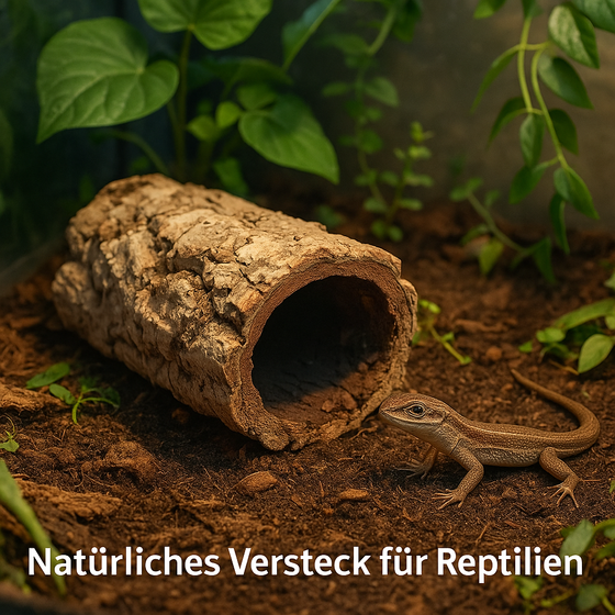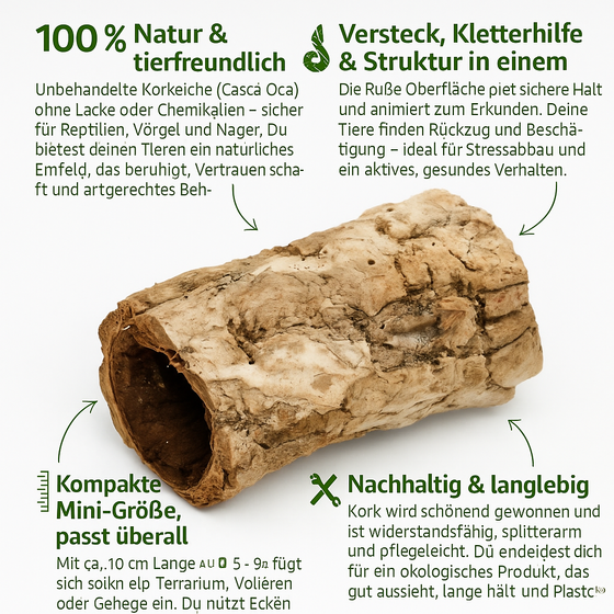 Bei dieser unbehandelten Korkrinde handelt es sich um die NaDeco Korkeiche „Mini“. Die Terrarien-Deko in Tunnelform wird aus Brasilien importiert. Der NaDeco Korktunnel verfügt über eine Länge von etwa 10 Zentimetern und einen Durchmesser, der zwischen 5 und 9 Zentimetern beträgt. Bei dieser NaDeco Korkhöhle Mini handelt es sich um ein unbehandeltes Naturprodukt, dies bedeutet, dass die Korkrinde weder eingefärbt noch auf eine andere Art und Weise chemisch behandelt wurde. Die Korkröhre ist hohl. Wird der NaDeco Korktunnel adäquat gehandhabt, verfügt das Naturprodukt über eine lange Haltbarkeit. Die NaDeco Korkeiche „Mini“ lässt sich zu differenten Zwecken verwenden. Der Korktunnel in Natur ist perfekt zum Dekorieren von Terrarien nutzbar. Aufgrund der Tatsache, dass die Korkrinde von NaDeco naturbelassen ist, lässt sich die Casca Oca Dekorinde auch wunderbar als Knabber- und Schreddermaterial für Vögel, Nagetiere und Reptilien einsetzen. Auch eignet sich die NaDeco Korkeiche „Mini“ ideal zum Fertigen von Vogelspielzeug. Um in Terrarien, Volieren und Hamsterkäfigen ein naturgetreues Habitat nachzubilden, lässt sich die Korkröhre „Mini“ von NaDeco auch ausgezeichnet mit weiteren unbehandelten natürlichen Dekoprodukten aus dem Sortiment des NaDeco Online-Shops wie zum Beispiel naturbelassenen Hölzern und Wurzeln, unbehandelten Kokosnuss-Produkten sowie Deko-Lianen in Natur und einer Vielzahl weiterer Naturdekoartikel kombinieren. Zu beachten gilt es, dass es sich bei dieser unbehandelten NaDeco Korkeiche „Mini“ um ein reines Naturprodukt handelt. Aus diesem Grund ist es möglich, dass die Korkröhre in Natur sowohl in Bezug auf ihre Größe als auch die Form und die Farbe von der Beschreibung und der Abbildung abweicht.