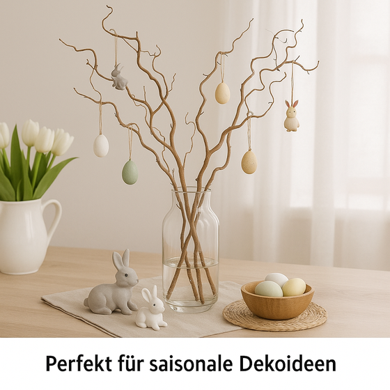 Schmücken Sie Ihren Contorta-Osterstrauch mit hübschen Deko-Eiern mit Federn oder mit Glitzer-Motiven sowie verschiedenen Naturfedern, beispielsweise Perlhuhnfedern, Zwerghuhnfedern, Fasanenfedern oder Pfauenfedern und anderen passenden Naturdekoartikeln wie exotischen Früchten, entsteht im Handumdrehen eine sensationelle Osterdeko, die Ihrem Zuhause einen festlich-frischen Touch verleiht.