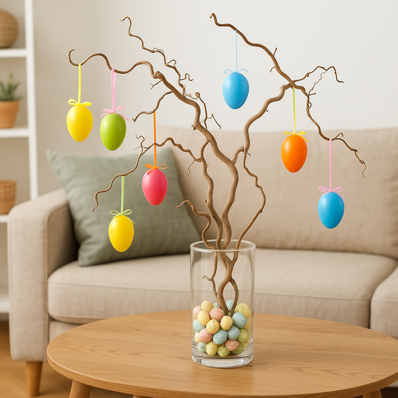 Die Dekoration Ihres Zuhauses mit einem fröhlich bunt geschmückten Osterstrauch ist eine schöne Art, den Frühling und die Osterfeiertage zu begehen. Arrangieren Sie diese Korkenzieherhasel-Zweige in einer imposanten Bodenvase, schaffen Sie gleichzeitig einen stilvollen und farbenfrohen Eyecatcher in Ihrem Zuhause.