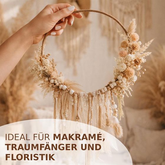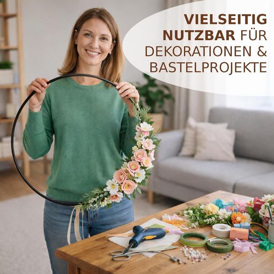 Durch seine glatte Oberfläche und die stabile Struktur lässt sich der Ring leicht verarbeiten und vielseitig einsetzen. Er ist ideal für Hochzeitsdekorationen, Adventskränze, Türkränze oder andere floristische Arrangements. Zudem eignet er sich perfekt als Rahmen für gehäkelte Kunstwerke, Lampenschirme oder kreative Mobile.