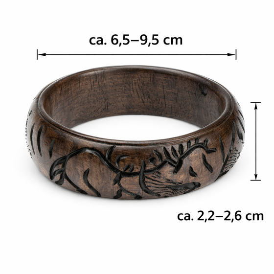 Jedes Stück ist traditionelle Handarbeit. Dadurch sind leichte Abweichungen bei Farbe, Form, Größe und Schnitzmotiven möglich und ausdrücklich Teil des Charakters: Du erhältst kein Massenprodukt, sondern ein Unikat aus afrikanischem Kunsthandwerk. Die geschnitzten Ornamente setzen einen authentischen Akzent und machen den Holzring zu einem Blickfang, der auch ohne großes Drumherum wirkt. Zusätzlich kann der Ring je nach Passform auch als Armreif getragen werden und verbindet so dekorativen Nutzen mit einem besonderen Accessoire aus Ebony Holz.