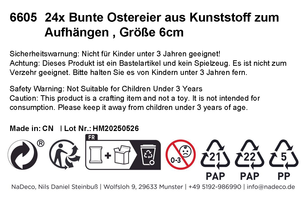 Die Ostereier bestehen aus robustem Kunststoff, sind wetterfest und damit bestens für den Einsatz im Außenbereich geeignet. Ob Regen, Wind oder Frühlingssonne – die Farben bleiben kräftig, die Oberfläche intakt. Jahr für Jahr können Sie die Eier wiederverwenden und Ihre Osterdekoration neu inszenieren.