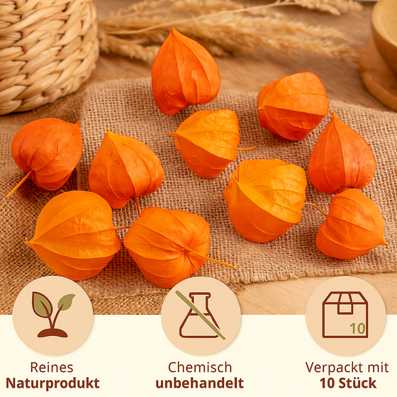 Bei diesen bezaubernden Blüten handelt es sich um getrocknete NaDeco Physalis franchetii und damit Blütenköpfe der Lampionblume. Die landläufig auch unter dem Namen Physalis Lampion, Lampionblumen oder Blasenkirchen bekannten Trockenblumen werden aus den Niederlanden importiert. Die Lieferung erfolgt in einem Beutel mit 10 Köpfen, wobei jeder einzelne Lampionblumen-Kopf eine Größe zwischen 4 und 5 Zentimetern aufweist. Die NaDeco Physalis franchetii wurden in einem aufwendigen Prozess getrocknet und sind bei sorgsamer Behandlung lange haltbar. Die Blütenköpfe kommen in einem leuchtenden Orange daher und sind naturbelassen, das heißt, die Trockenblumen wurden weder eingefärbt noch auf andere Art und Weise chemisch behandelt. Die NaDeco Physalis franchetii hat ihr natürliches Habitat in Südamerika, genauer in den Anden, allerdings wird die Lampionblume mittlerweile auch in Südafrika sowie Europa und anderen Ländern kultiviert. Diese Köpfe der NaDeco Physalis franchetii sind äußerst dekorativ und können zum Dekorieren, Basteln und zur sonstigen Weiterverarbeitung vorrangig im Bereich der Floristik zum Einsatz kommen. Die Lampionblumen-Köpfe eignen sich, um in Blumenkränze und Blumengestecke integriert, zum Verzieren von Flower-Hoops sowie als Füll- und Streudekoelemente für Glasvasen, Dekoschalen oder Festtafeln genutzt zu werden. Zudem lassen sich mithilfe der Köpfe der Lampionblume Lichterketten verzieren, um für ein einzigartiges herbstliches Ambiente zu sorgen. Die NaDeco Physalis franchetii eignen sich zum Dekorieren von Privat- und Geschäftsräumen und können hervorragend mit anderen Naturdekoelementen wie getrockneten Blumen, Gräsern und Blätter, Naturkränzen, Zierkürbissen und vielen anderen Artikeln kombiniert werden. Aufgrund der Tatsache, dass es sich bei diesen Lampionblumen um reine Naturprodukte handelt, ist es möglich, dass die Köpfe der NaDeco Physalis franchetii in Bezug auf ihre Farbe, Form und Größe von der Artikelabbildung und der Produktbeschreibung abweichen. Achtung: Bei diesen NaDeco Physalis franchetii handelt es sich um reine Deko-Produkte, die aufgrund ihrer Toxizität keinesfalls verzehrt werden dürfen.