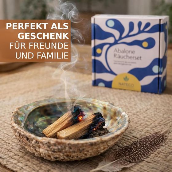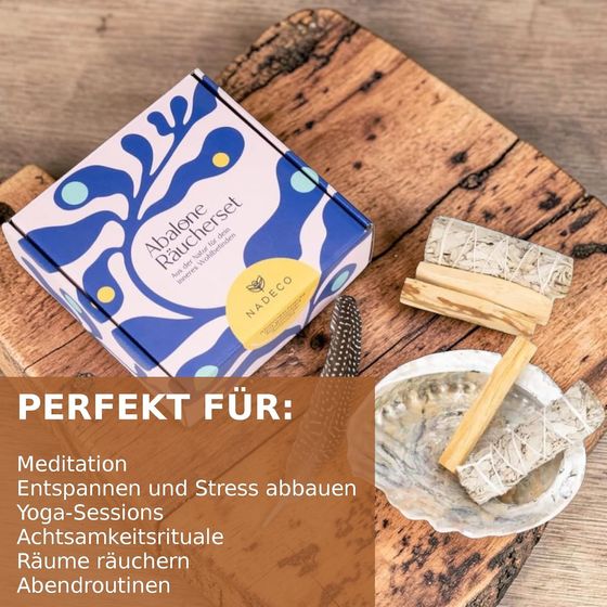 Dieses Räucherset ist ein Smudge Kit mit Abalone Muschel als Räucherschale, Weißem Salbei und Palo Santo zum Räuchern, geeignet für Meditation, Yoga, Achtsamkeit, Ausräuchern von Räumen und spirituelle Rituale. Es ist außerdem eine beliebte Geschenkidee für Menschen, die Wellness, Duft und Wohnatmosphäre lieben.