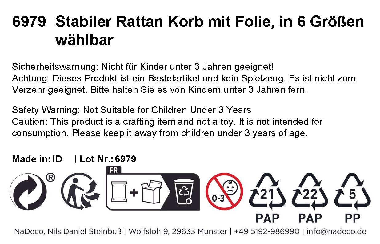 Sie erhalten 1× Rattan Pflanzkorb in der gewählten Größe, mit Folie und Henkeln; die abgebildete Menge entspricht der gelieferten Menge. Jedes Stück ist handgefertigt – leichte Farb- und Maßtoleranzen sind naturbedingt und unterstreichen den Charakter. Pflege: trocken lagern, Staub mit weichem Tuch entfernen. Jetzt bei NaDeco bestellen und Ihre Dekoprojekte aufwerten.
