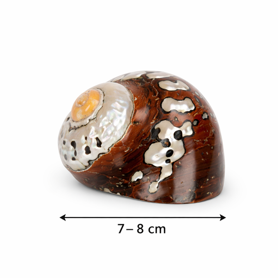 Das geschliffene und polierte Turbo sarmaticus Schneckenhaus bringt maritime Eleganz in dein Zuhause und wirkt durch seine freigelegte Perlmuttschicht besonders edel. Jede Turban Schnecke ist ein echtes Naturprodukt und wurde sorgfältig gereinigt, anschließend durch Schleifen veredelt und zum Schluss auf Hochglanz poliert. Dadurch entsteht eine spiegelglatte, glänzende Oberfläche, die das Licht weich reflektiert und Dekorationen sofort hochwertiger erscheinen lässt. Mit einer Größe von ca. 7–8 cm eignet sich das Schneckengehäuse ideal als einzelner Blickfang auf Sideboard, Fensterbank oder im Badezimmer, macht aber auch in Arrangements mit Muscheln und Schnecken eine starke Figur. Ob Küstendeko, Stranddeko, Tischdeko oder als Akzent im Fischernetz: Das große Schneckenhaus lässt sich vielseitig kombinieren und passt zu natürlichen Materialien wie Treibholz, Glas, Sand und Leinen. Für DIY-Projekte ist es ebenfalls perfekt geeignet, zum Beispiel für Muschelkranz, Muschelkette, Mobile oder kreative Bastelideen im maritimen Stil. Auch im Aquarium ist die Deko Schnecke eine attraktive Ergänzung: In Süßwasser, Brackwasser oder Meerwasser kann sie als Versteck, Unterschlupf oder Ruheplatz dienen und unterstützt ein natürlich wirkendes Aquascaping. Zudem kann das Schneckenhaus, je nach passender Größe, als Wechselhaus für Einsiedlerkrebse genutzt werden. Da jedes Stück einzigartig ist, können Form, Farbe und Muster leicht variieren – genau das macht den besonderen Charme dieses echten Meeresschnecken Gehäuses aus.