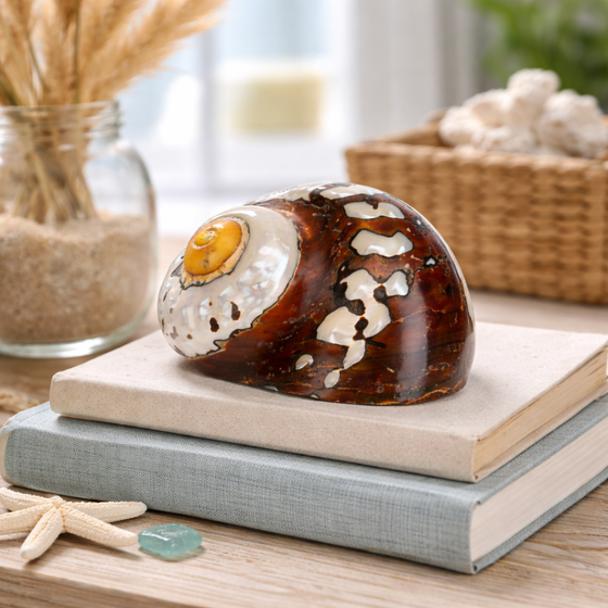 Dieses geschliffene und polierte Schneckenhaus der Turbo sarmaticus Turbanschnecke ist ein hochwertiger Naturdeko Akzent für alle, die maritime Deko lieben. Durch das sorgfältige Reinigen, Schleifen bis zur schimmernden Perlmuttschicht und anschließende Polieren entsteht eine spiegelglatte, glänzende Oberfläche, die Licht sanft reflektiert und Arrangements sofort edler wirken lässt. Ideal als einzelnes Statement Piece auf Sideboard, Fensterbank oder im Badezimmer, aber auch perfekt als Ergänzung zu Muscheln und Schnecken für Küstendeko, Stranddeko und stilvolle Tischdeko.