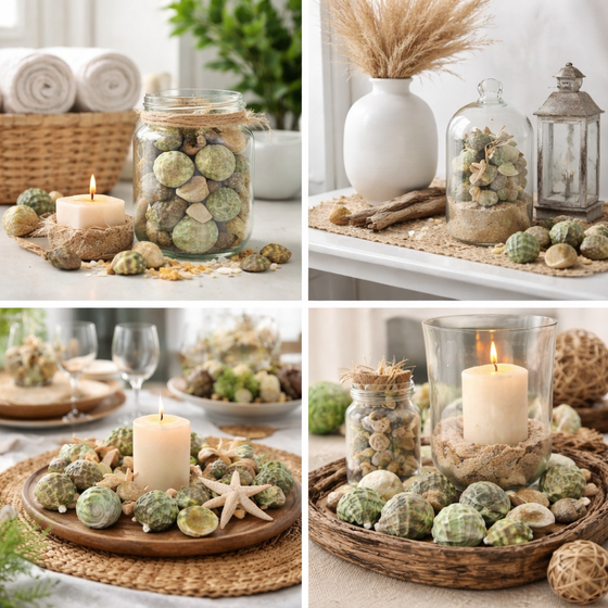 Unsere Turbo sparverius Schneckenhäuser überzeugen durch ihr authentisches, natürliches Aussehen, ihre robuste Struktur und die harmonische Farbpalette aus Grün-, Creme- und Brauntönen. Diese Eigenschaften machen sie ideal für liebevoll gestaltete Deko-Arrangements – ob in Glasvasen, auf Deko-Tabletts, als Füllmaterial oder als maritimer Akzent auf deinem Couchtisch oder Regal. Aufgrund der Naturbelassenheit kann jedes Schneckenhaus in Form und Farbe variieren, was jedem Dekoobjekt einen individuellen Charakter verleiht.