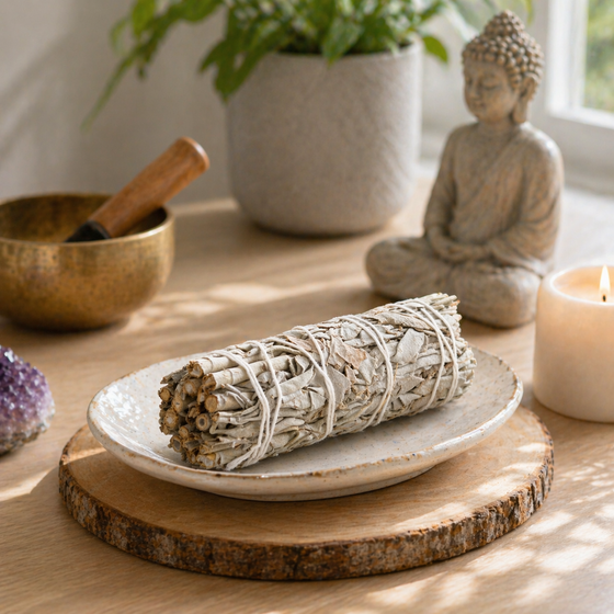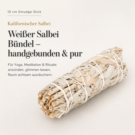Der Weiße Salbei Räucherbündel 25–30g Smudge Stick, Länge 10cm, ist ein naturbelassenes Räucherwerk für alle, die Räume bewusst klären und eine ruhige, stimmige Atmosphäre schaffen möchten. Weißer Salbei, auch als Salvia apiana bekannt, wird traditionell für Reinigungsrituale, Hausräucherungen, Meditation und Yoga verwendet. Durch seinen würzig-aromatischen Duft ist dieses Räucherbündel eine beliebte Wahl für Menschen, die Wert auf Achtsamkeit, spirituelle Rituale und natürliche Wohnraumreinigung legen. Mit seinem kompakten Format von ca. 10 cm und einem Gewicht von etwa 25–30 g lässt sich der Smudge Stick leicht anwenden und gut dosieren. Zum Räuchern wird die Spitze vorsichtig angezündet, kurz angeblasen und anschließend in einer feuerfesten Schale oder Muschel zum Verglimmen gebracht. Der entstehende Rauch verteilt sich angenehm im Raum und wird oft genutzt, um belastende Stimmungen zu klären, neue Energie einziehen zu lassen und Wohnbereiche bewusster zu gestalten. Damit eignet sich der weiße Salbei ideal für Wohnzimmer, Schlafzimmer, Praxisräume, Eingangsbereiche oder Meditationsorte. Der kalifornische weiße Salbei überzeugt durch seine natürliche Beschaffenheit und seine traditionelle Verwendung im Bereich Räucherwerk und Raumreinigung. Viele Menschen nutzen ihn für energetische Reinigung, zur Vorbereitung auf Yoga oder Meditation oder als festes Ritual im Alltag. Gerade in Zeiten, in denen Rückzug, Ausgleich und bewusste Wohnatmosphäre wichtiger werden, ist ein Salbei Räucherbündel eine stilvolle und zugleich einfache Möglichkeit, das Zuhause neu auszurichten. Auch als Geschenk für spirituell interessierte Menschen, für Yoga-Fans oder für Liebhaber natürlicher Rituale ist dieses Räucherbündel sehr passend. Wer weißen Salbei kaufen möchte, um Räume auszuräuchern, eine harmonische Atmosphäre zu schaffen oder ein traditionelles Reinigungsritual in den Alltag zu integrieren, findet hier ein hochwertiges Naturprodukt mit vielseitigem Einsatzbereich. Ob für regelmäßige Hausräucherungen, für achtsame Rituale am Abend oder zur bewussten Vorbereitung eines neuen Abschnitts: Dieser weiße Salbei Smudge Stick verbindet Natürlichkeit, traditionelle Anwendung und dekorative Schlichtheit in einem Produkt. Er unterstützt eine klare, ruhige Umgebung und bringt den charakteristischen Duft von hochwertigem kalifornischem Salbei in dein Zuhause. • ✅ Räucherset mit Salbei, Palo Santo und Muschel für dein Ritual ✅ Eigenschaften auf einen BlickWeißer Salbei Räucherbündel 25–30g Smudge Stick, Länge 10cm